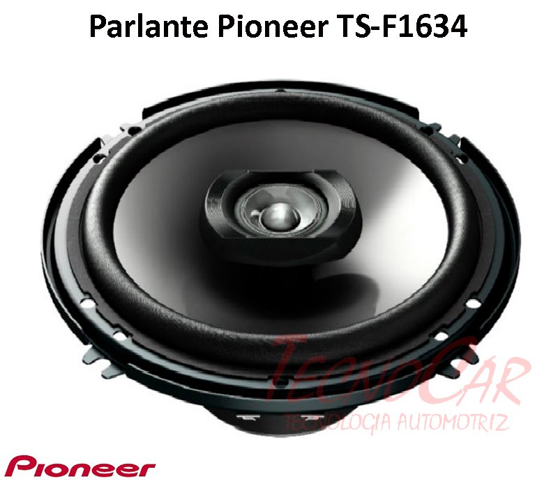 Parlantes Pioneer TS-F1634 de 6.5” 2 vías con 200W máxima potencia. Sonido claro y mejora inmediata del audio original del vehículo.